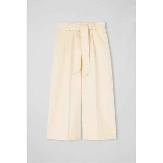 The Lena trousers are crafted from cream cotton. They sit on the waist with a tie belt, have side pockets, back welt pockets, a wide cut with pressed centre creases and a cropped ankle length.
