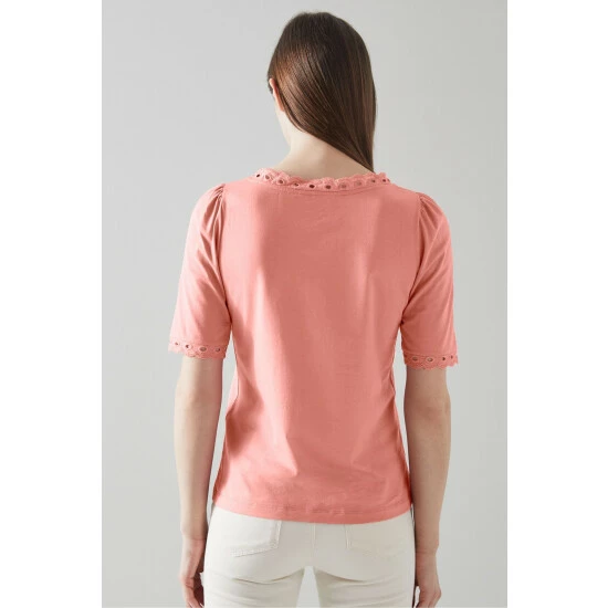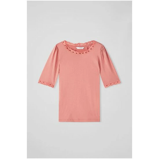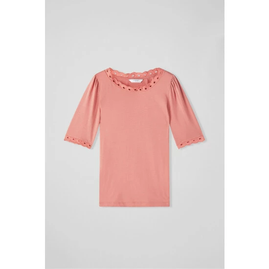 The Lilly T-shirt is crafted in Portugal from rose pink jersey. It has a round neck trimmed with broderie anglaise, short sleeves with puff shoulders and a matching trim, and a classic, regular cut.