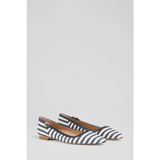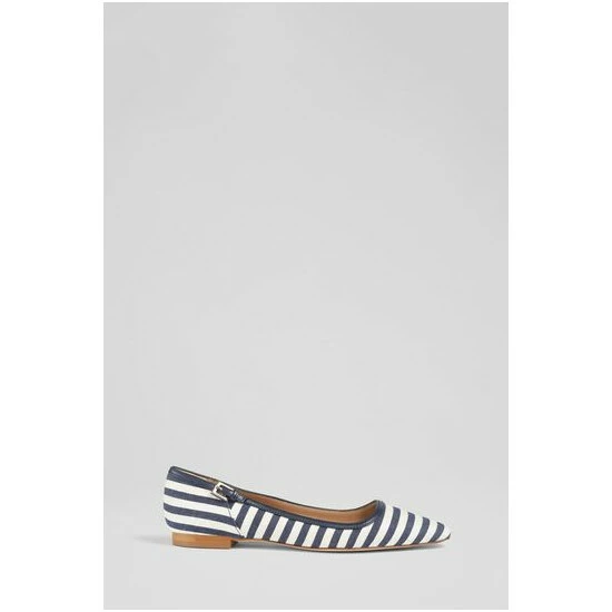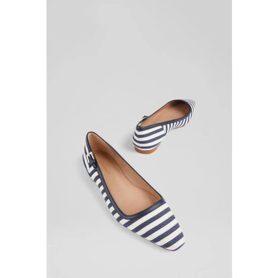 The Andrea flats have been crafted in Spain from a navy and cream striped fabric. They have a squared-off toe, a navy leather trim with silver buckle detail and a low stacked heel.