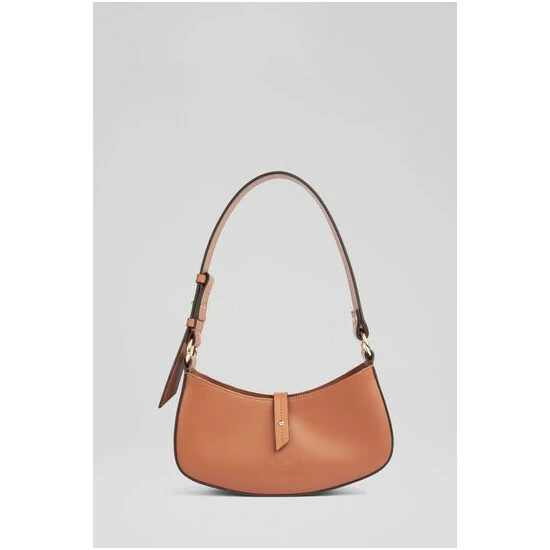 The Beatrice shoulder bag is crafted in Italy from smooth tan leather. It has a sleek baguette shape, an adjustable-length shoulder strap, a popper fastening, a fabric lining and an inside zip pocket.