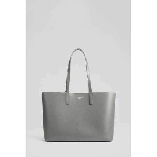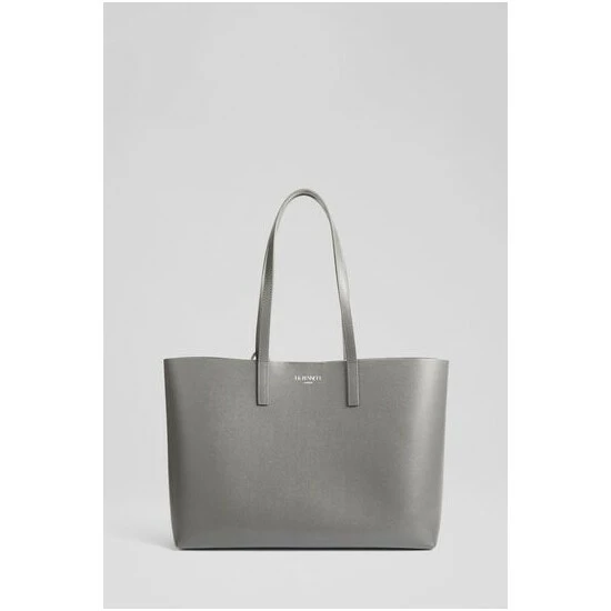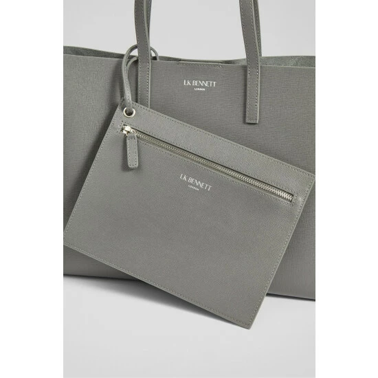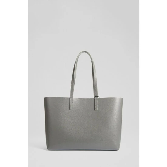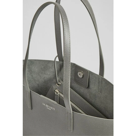 The Adele tote is crafted in Italy from recycled saffiano leather in dark grey. It’s a large open tote with double handles, a popper fastening and is unlined with a zip-across pouch on a removable strap inside.
