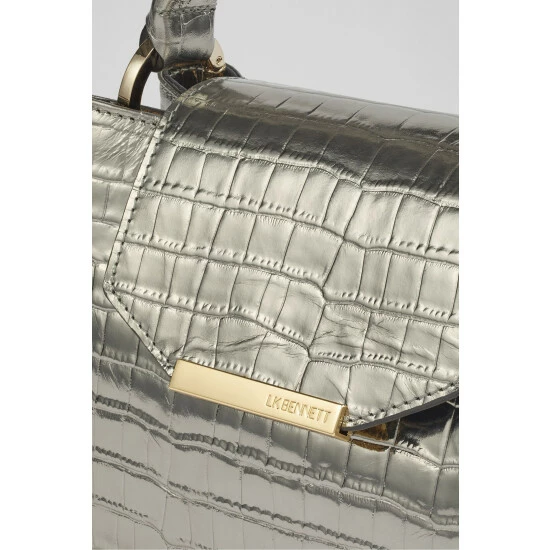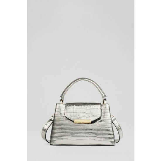 The Mini Harbour tote bag is crafted in Italy from gunmetal croc-effect leather. It’s a small trapeze-shaped tote with a short large handle, a removable and adjustable shoulder strap and a fold over top with a hidden popper. Inside it has two compartments and a slip pocket.