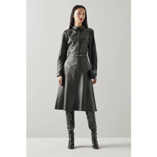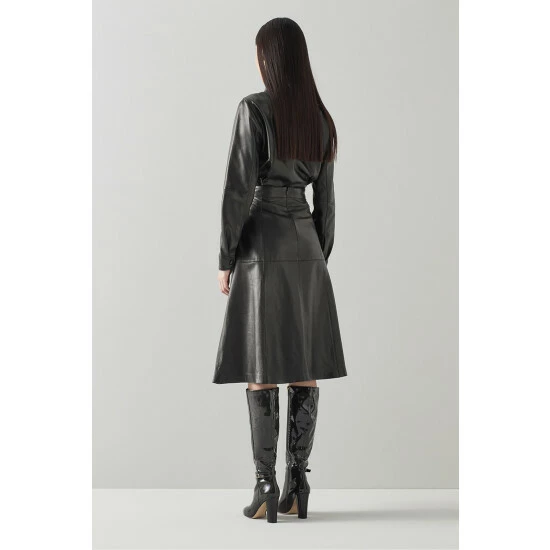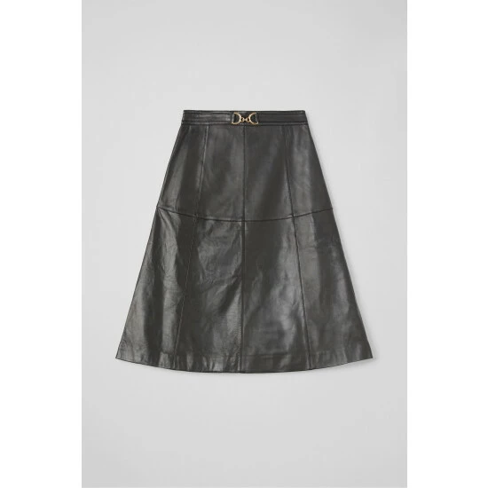 The Monmouth skirt is crafted from black leather. It sits on the waist, has gold snaffle detail, an A-line shape with seam detail and falls to the knee.