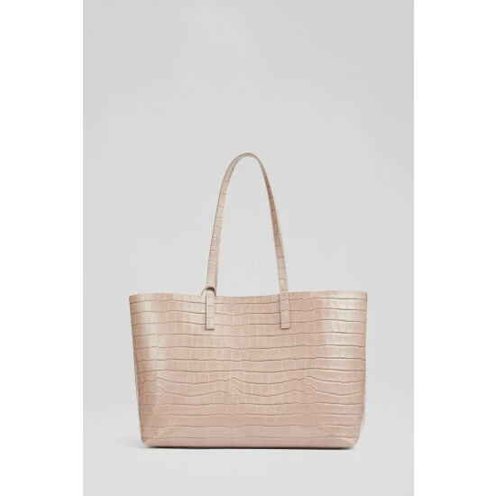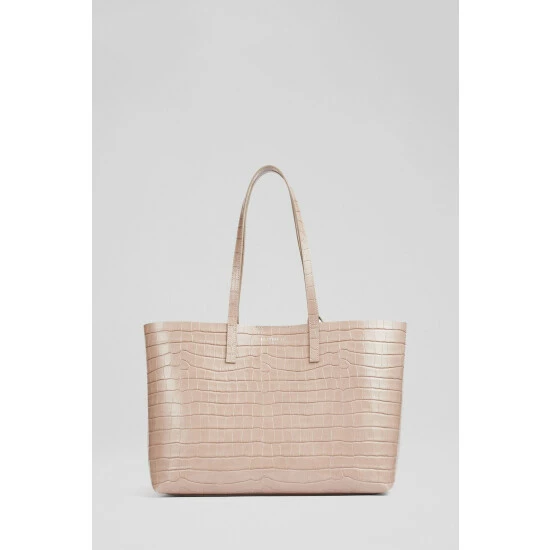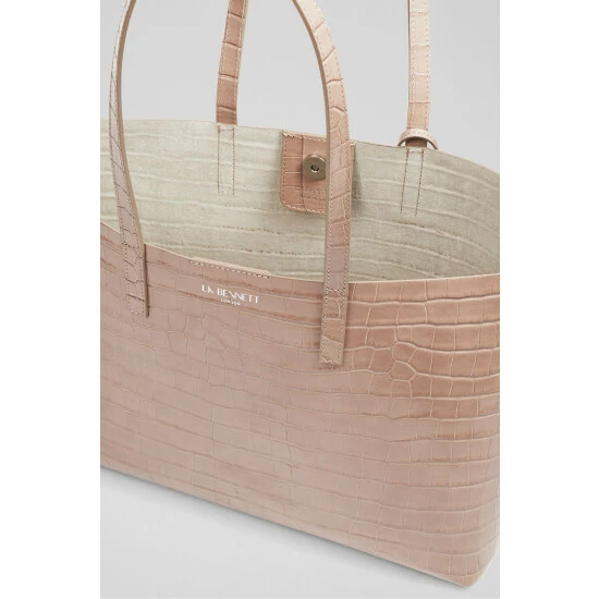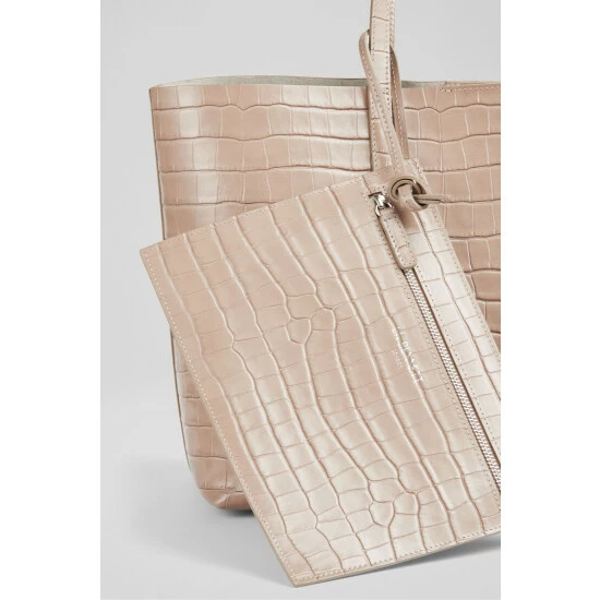 The Adele tote is crafted in Italy from recycled croc-effect leather in taupe. It’s a large open tote with double handles, a popper fastening and is unlined with a matching zip-across pouch on a removable strap inside.