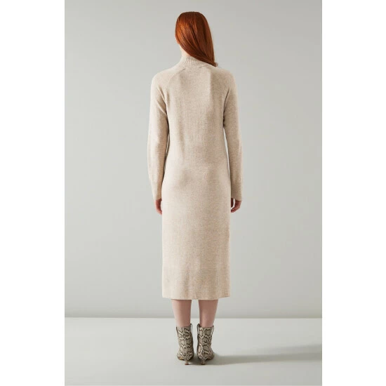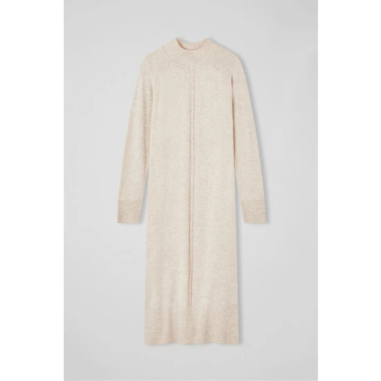 The Bergen jumper dress is crafted from a merino wool blend in oatmeal. It has a funnel neck, raglan long sleeves, a ladder stitch running through the centre, a relaxed fit and it falls to the knee.