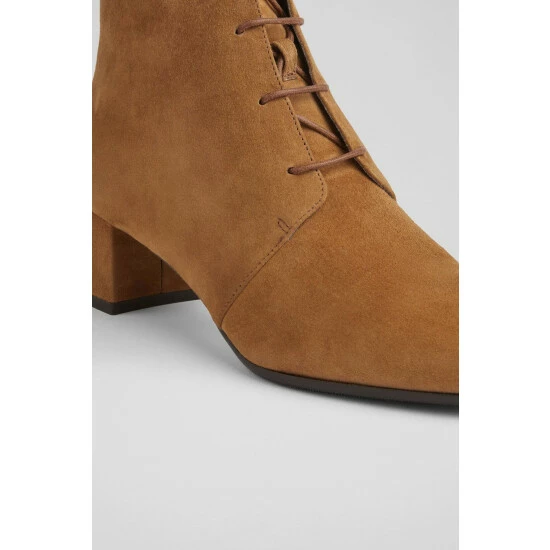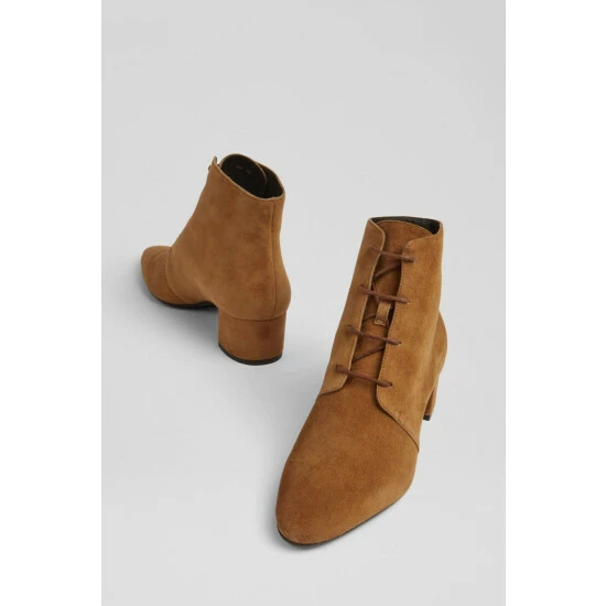 The Lola lace-up ankle boots are crafted in Italy from tan suede. They have an almond-shaped toe, a lace-up front with no inside zip, a short ankle cut and a 45mm suede-wrapped block heel.