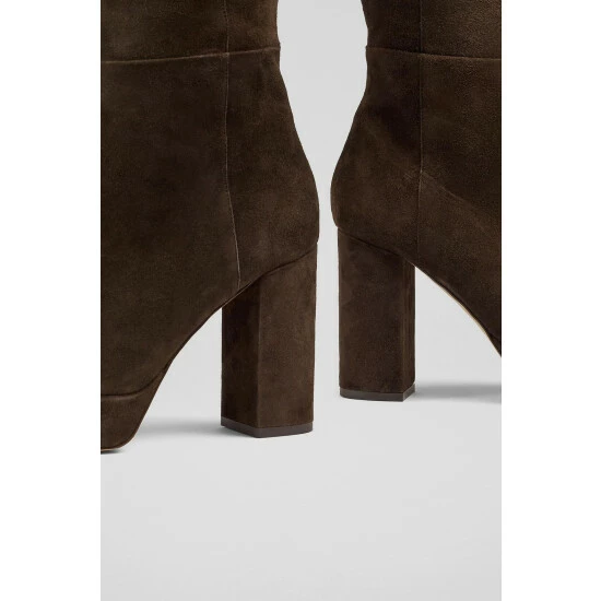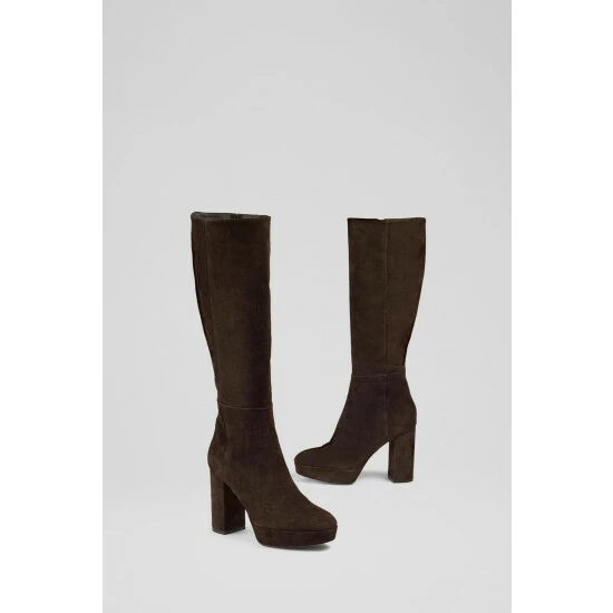 The Lucinda knee-high boots are crafted in Italy from dark brown suede. They have a square toe, a platform sole, an inside zip and a 110mm block heel wrapped in matching suede.