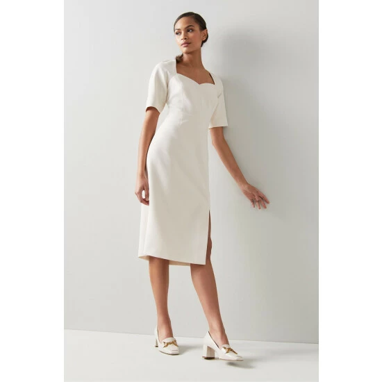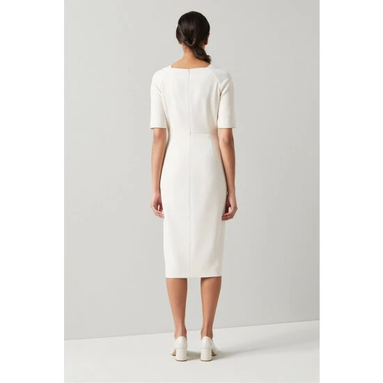 The Lux shift dress is crafted from stretch crepe in cream. Part of the Royal Ascot x LK Bennett collection, it has a sweetheart neckline, short sleeves, a fitted bodice and a pencil-style skirt with a slit over one knee.