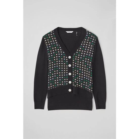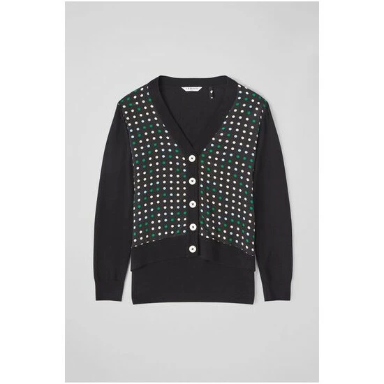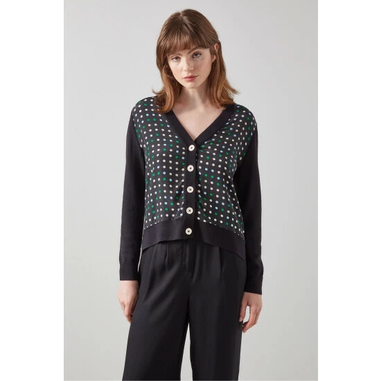 The Maisie spot front cardigan is crafted from merino wool in black with a 1960s-inspired optical spot print in mint green, powder blue and cream on silk to the front. It has a V-neck, cream buttons, long sleeves and a relaxed shape.