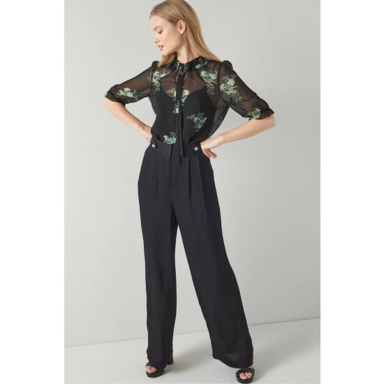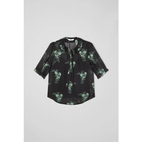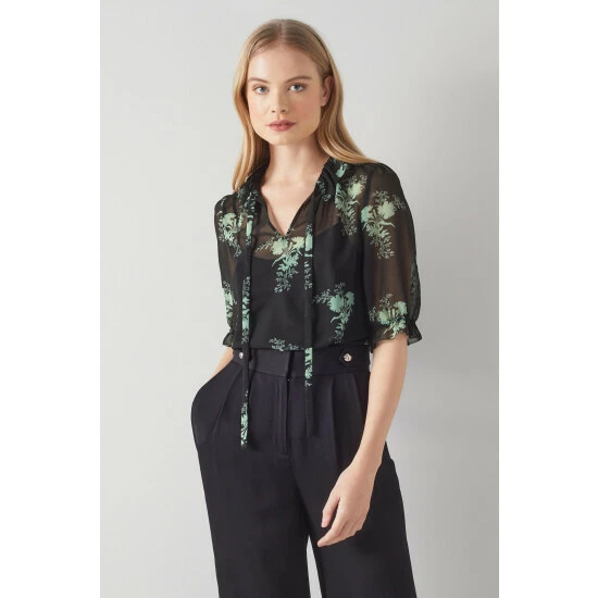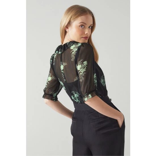 The Margot blouse is crafted from silky georgette with a meadow print. It has a frill collar with tie detail, three-quarter ruched sleeves, a relaxed fit and a scooped hemline