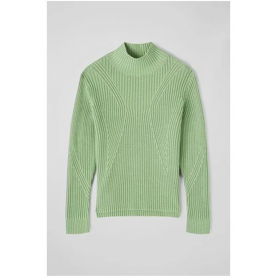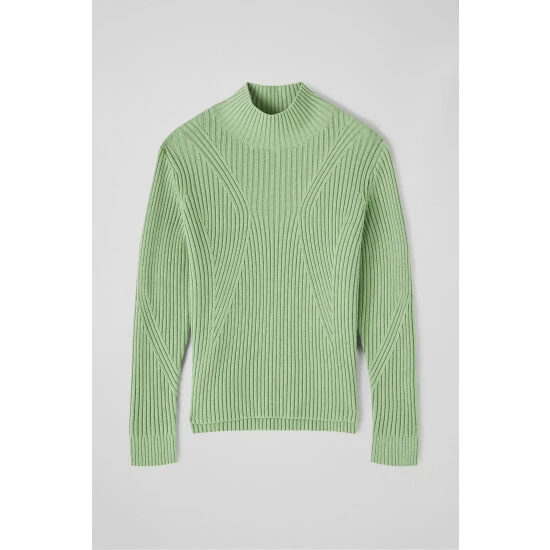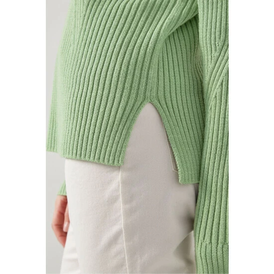 The Melody wide rib jumper is crafted from a soft cotton-wool blend in soft mint green. It has a turtle neck, a shapely, all-over wide rib design and a long length with side slits at the hem.