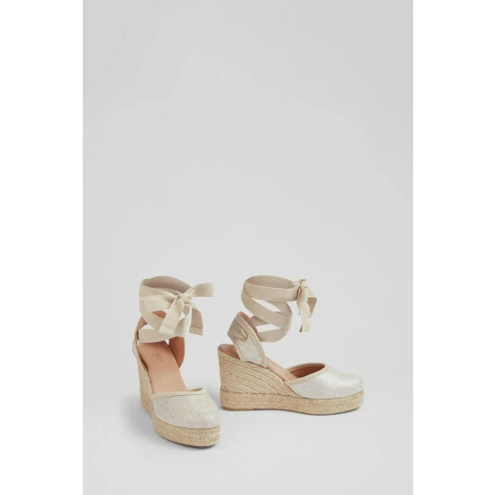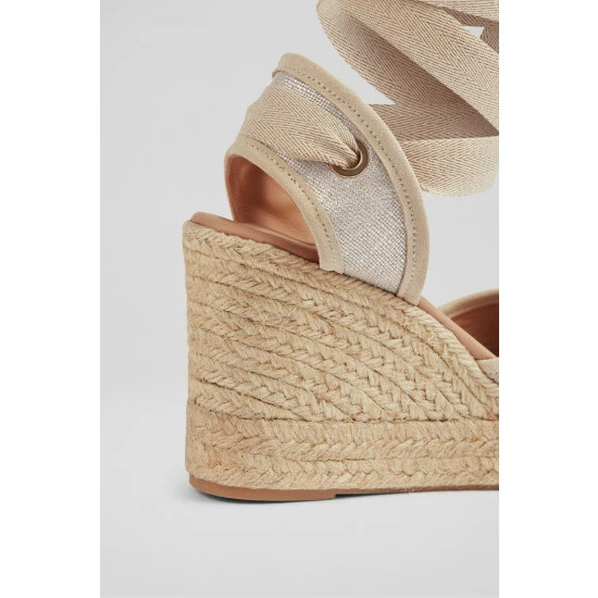 The Sophie espadrilles are crafted in Spain from chic, gold-hued canvas. They have a closed almond-shaped toe, beige tie-up straps and a matching espadrille wedge heel.