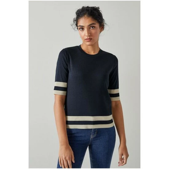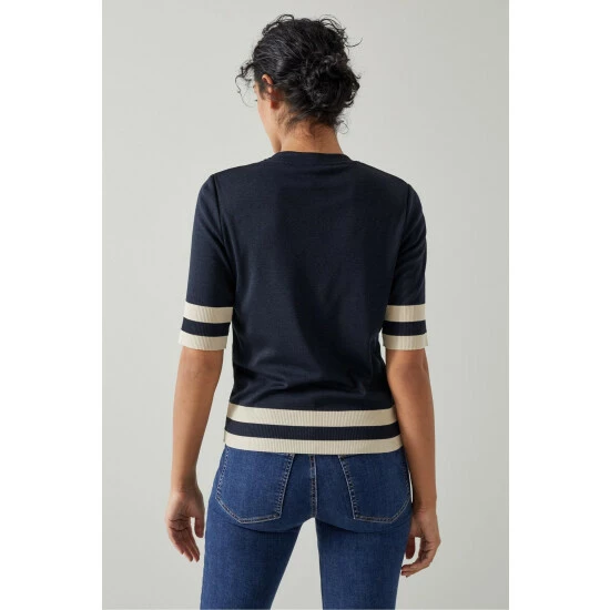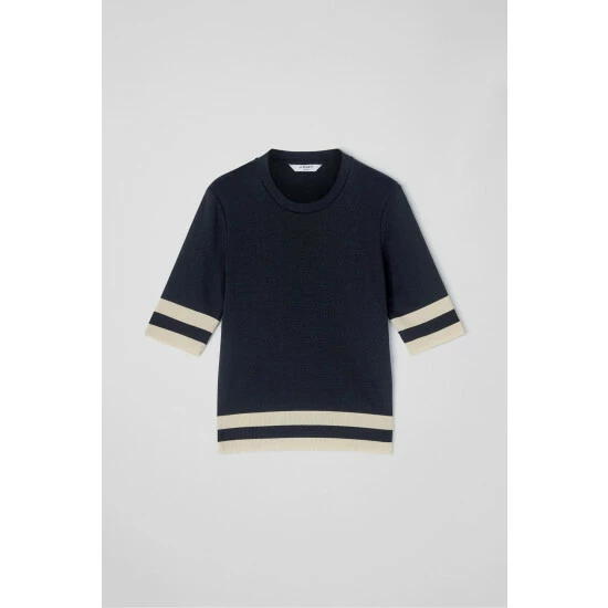 The Michi top is crafted in Portugal from a Lyocell-cotton blend in navy blue. It has a round neck, short sleeves, a classic fit and contrast cream block colour stripes to the sleeves and hemline.