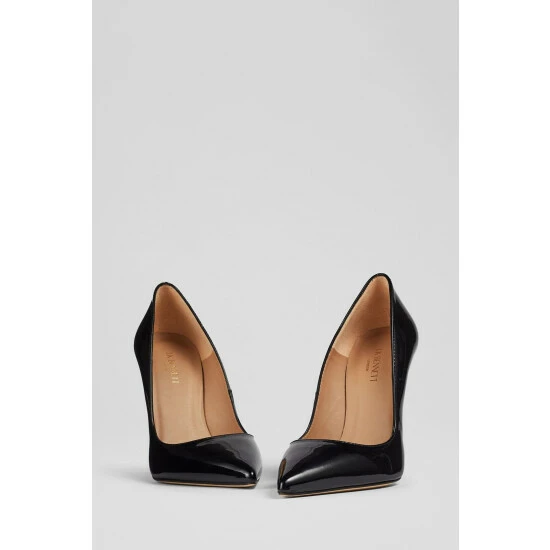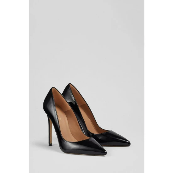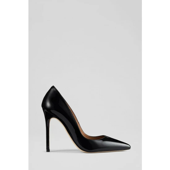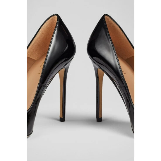 The Monroe court shoes are crafted in Spain from black patent leather. They have a pointed toe, an ultra-sleek silhouette and a very high 110mm stiletto heel.