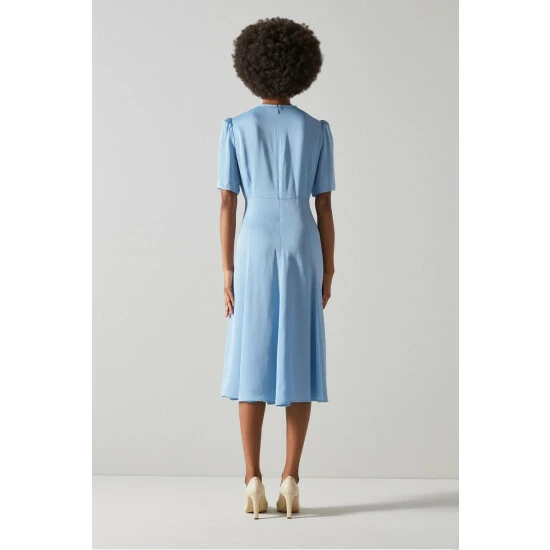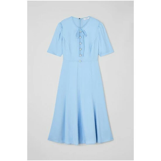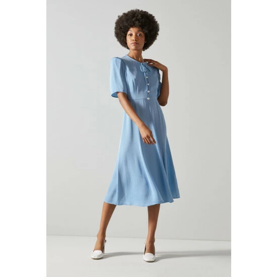 The Montana tea dress is crafted from silky crepe in pale blue. It’s a midi-length, short-sleeved style with oversized pearl buttons and tie detail to the collar.