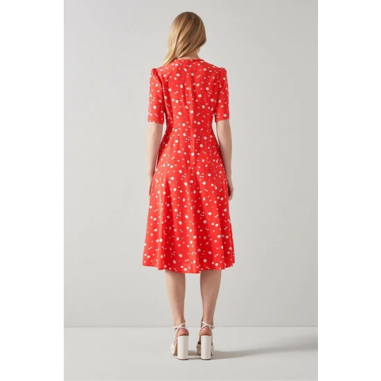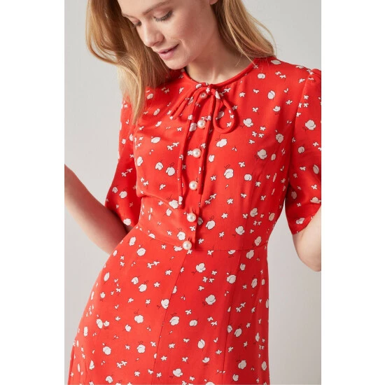 The Montana tea dress is crafted from silk in their naive flower print in red and cream. It’s a midi-length, short-sleeved style with oversized pearl buttons and tie detail to the collar.