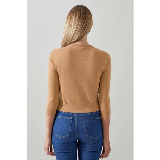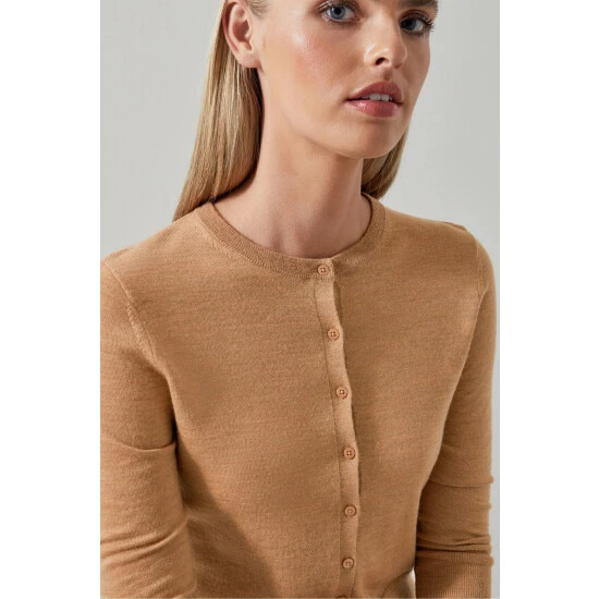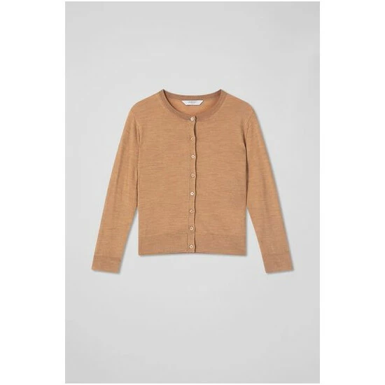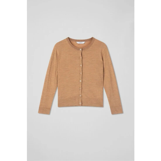 The Bonnie cardigan is crafted from merino wool in camel. This round neck, lightweight style buttons through with matching-colour buttons, has bracelet-length sleeves, a regular fit and ribbed detail to the neckline, cuffs and hemline.