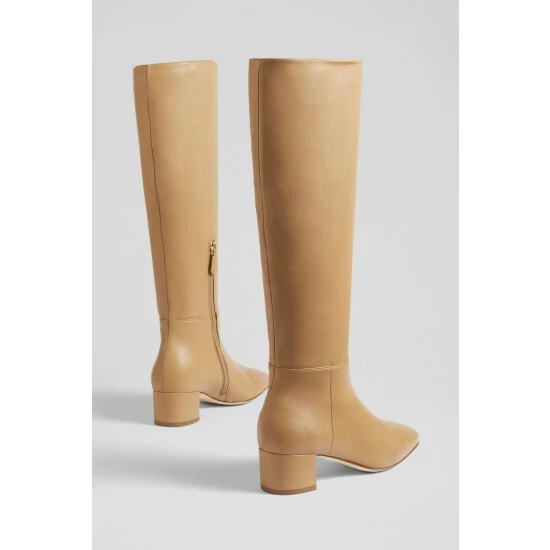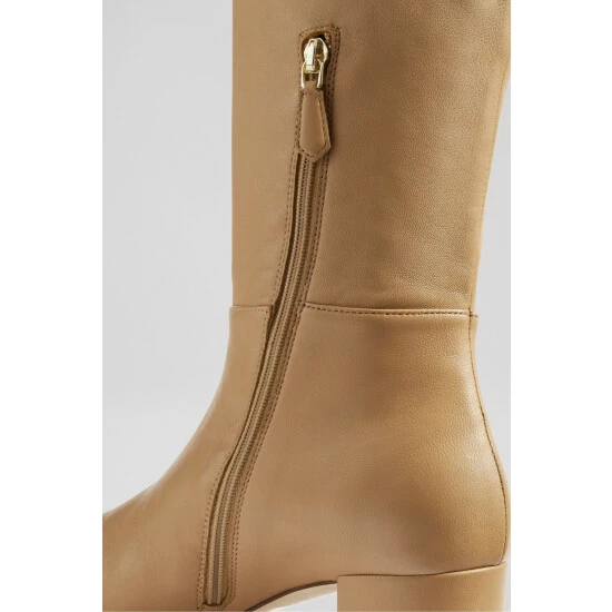 The Karen knee-high boots are crafted in Italy from camel nappa leather. They have round toes, a half zip on the inside of the leg and low, 45mm block heels covered in leather.