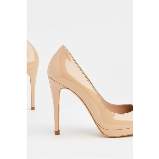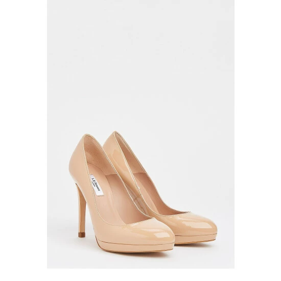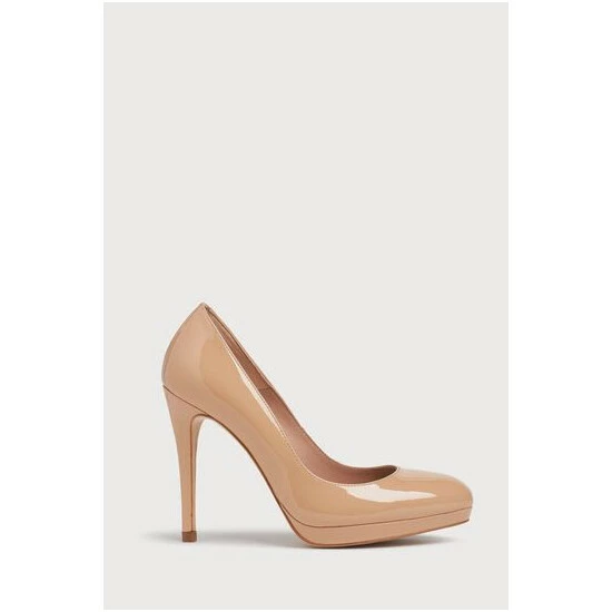 Crafted in Spain from glossy beige patent leather, they have an almond-shaped toe, a slim 15mm platform sole sitting on non-slip resin and an elegant 110mm stiletto heel.