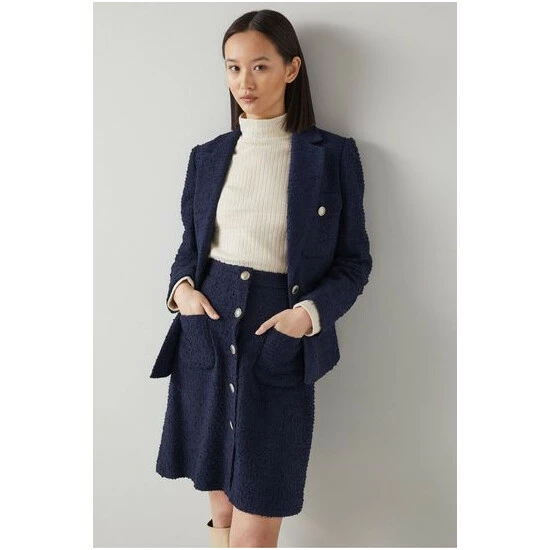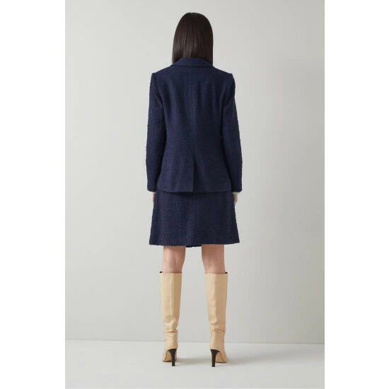 The Lottie jacket is crafted in Europe from Italian navy blue tweed, it’s a longline, single-breasted style with a notch lapel, hammered matte buttons and double patch pocket detail.