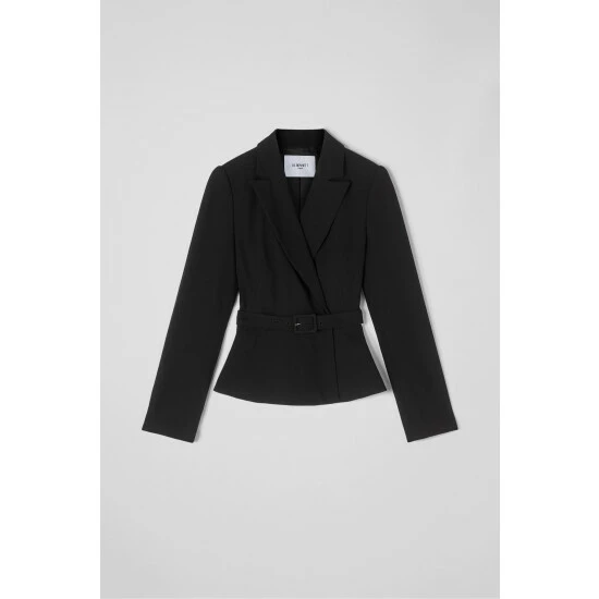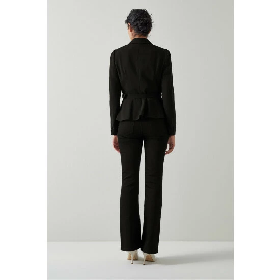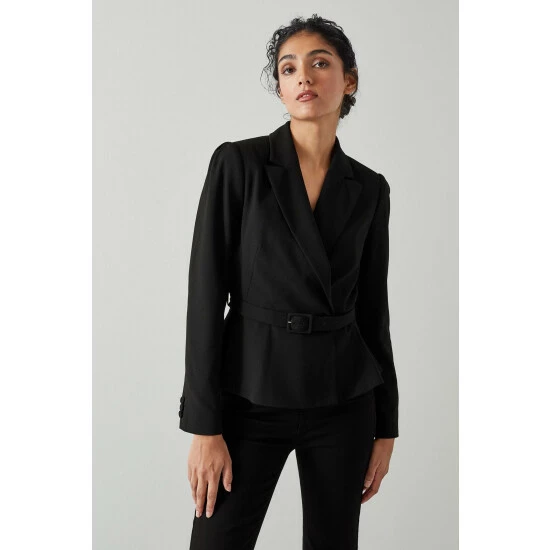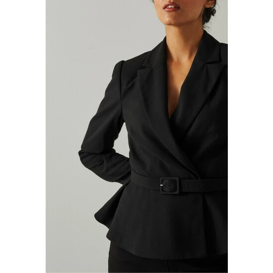 The Nina jacket is crafted from lightweight black fabric. It has a wide peak lapel, a curvaceous shape, a buckle belt and a peplum hem.