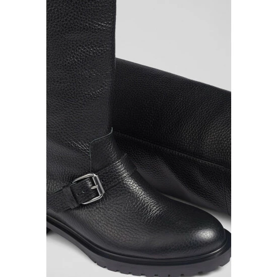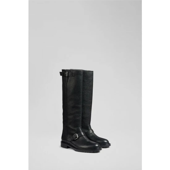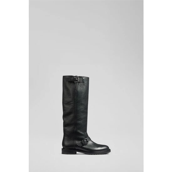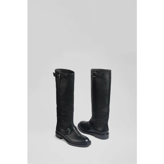 The Noemi knee-high biker boots are crafted in Italy from grainy black leather. They pull on with adjustable buckle detail on the leg and have an almond-shaped toe, a buckle across the front and a chunky sole with a 40mm flat heel.