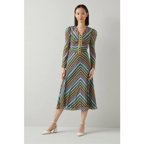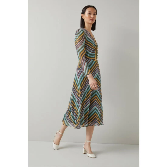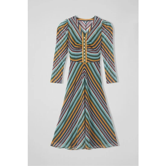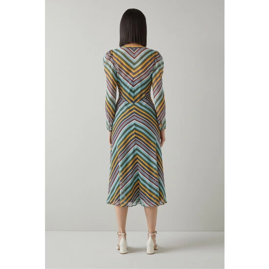 The Odelia midi dress is crafted from silk georgette in yellow, purple, blue and green chevron stripes. It has a V-neck with a half placket of decorative pearl buttons, pleating at the shoulders, long sleeves and a midi-length floaty cut.