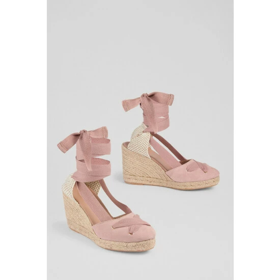 The Ophelia espadrilles are crafted in Spain from peachy pink suede. They have a round toe, crossover strap detail across the front, over the foot and around the ankles, and they have a natural raffia wedge sole.