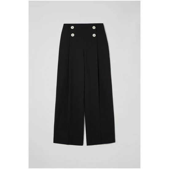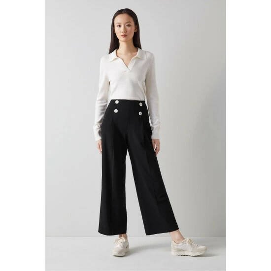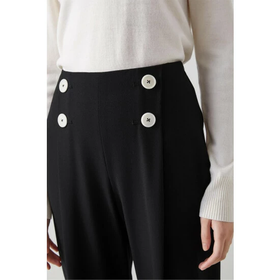 The Parker trousers are crafted from a lightweight black fabric. They sit high on the waist, have with four white buttons across the front, a side zip, centre creases and a wide-cut, cropped shape.