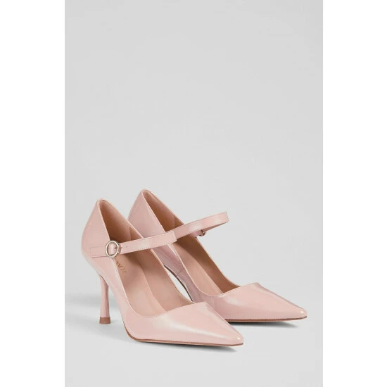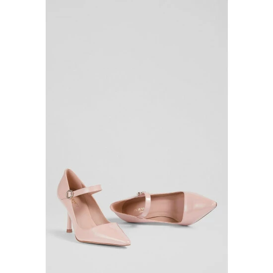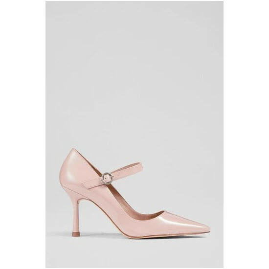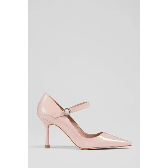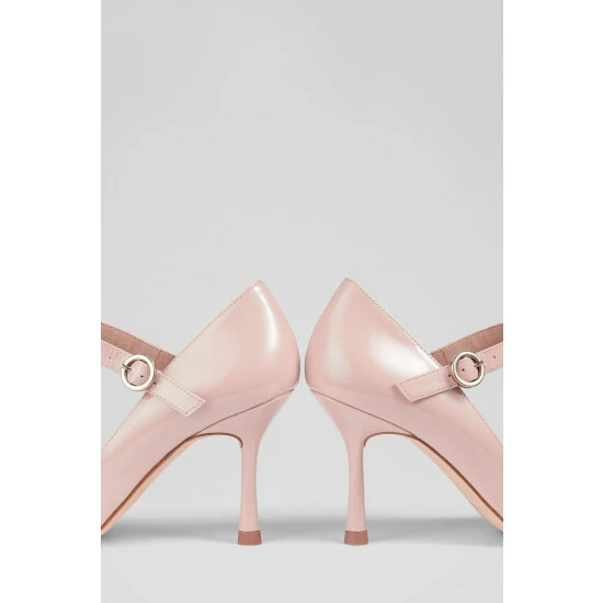 The Camille courts are crafted in Spain from blush pink patent leather. They have a pointed toe, Mary-Jane styling with a round buckle and an 85mm stiletto heel.