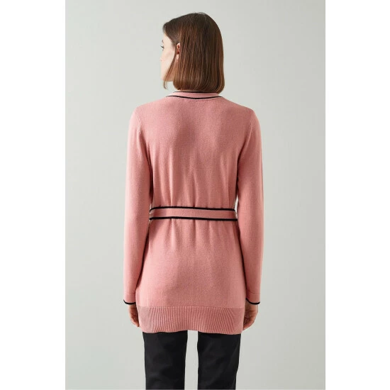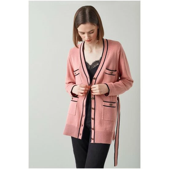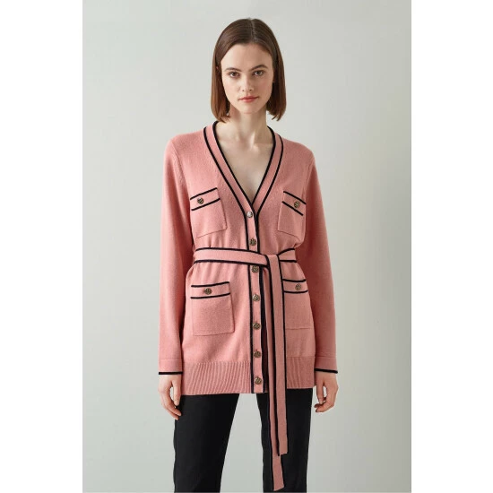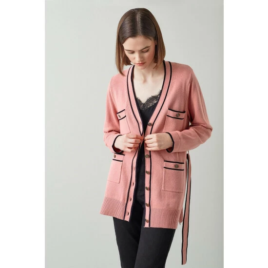 The Gaia long cardigan is crafted from a pink wool-cotton blend. It’s a V-neck style that buttons to the top of the thigh with gold buttons, it has double patch pockets, a tie belt and is finished with navy tipping detail.
