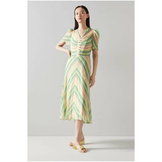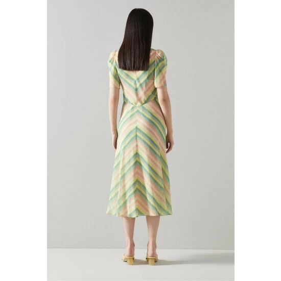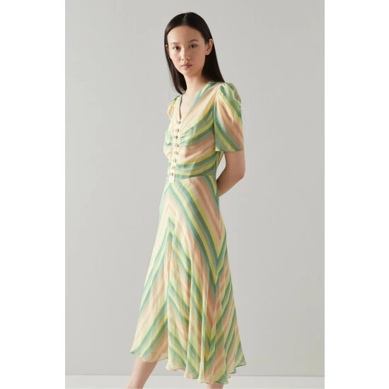 The Holzer midi dress is crafted from silk in a cream, pink and green candy stripe. It has short sleeves with subtle pleating at the shoulders, a V-neck, oversized pearl buttons and a long floaty cut.