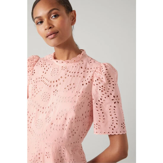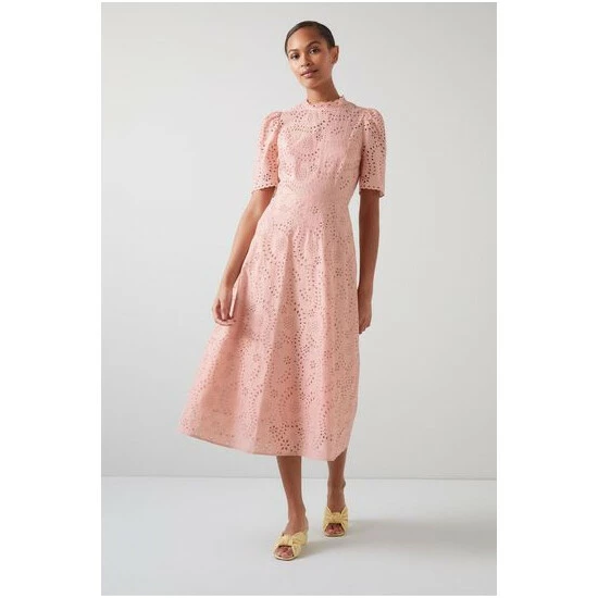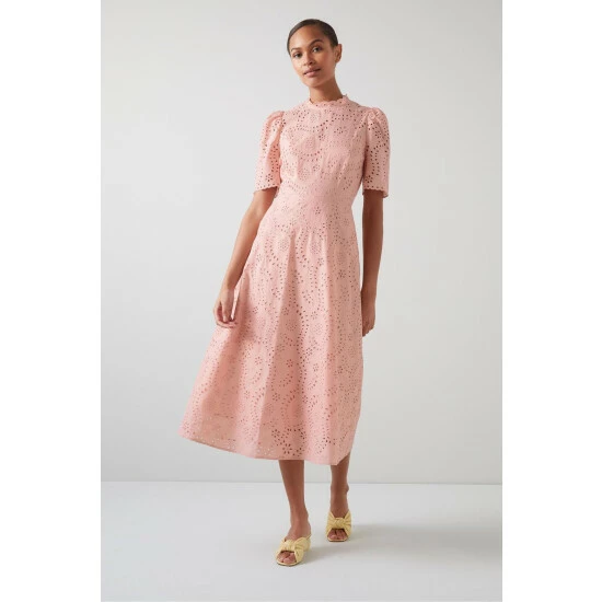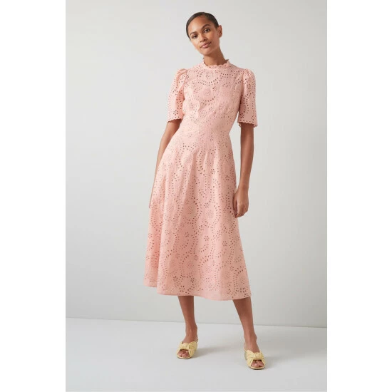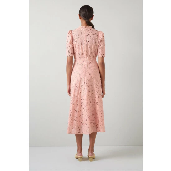 The Honor dress is crafted from pink cotton by Swiss lace makers, taking inspiration from their archives. It has a round neck with frill detail, short sleeves, a nipped waist and a flared midi-length skirt.