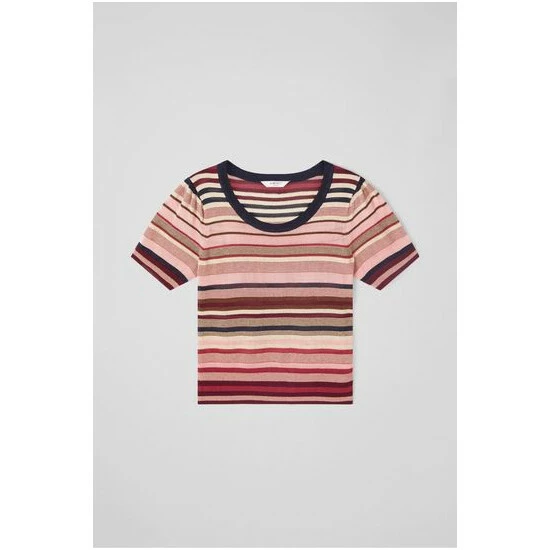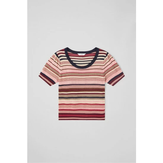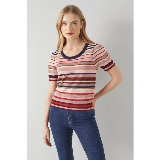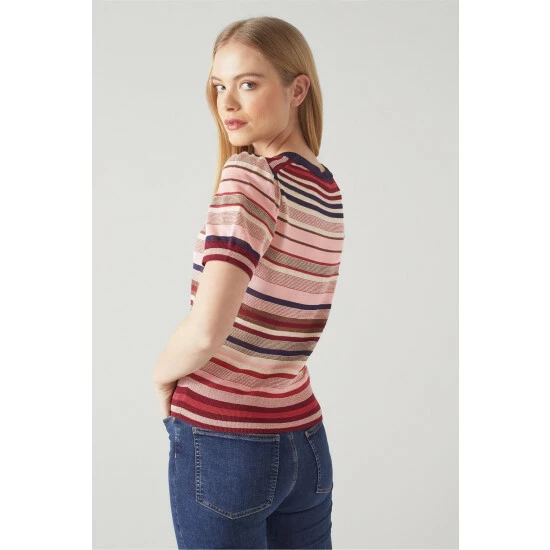 The Lillian knitted top is crafted from a pink, red and navy stripe metallic thread fabric. It has a round neck, puff shoulders, short sleeves and a regular fit.