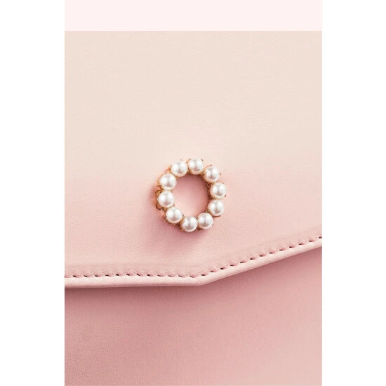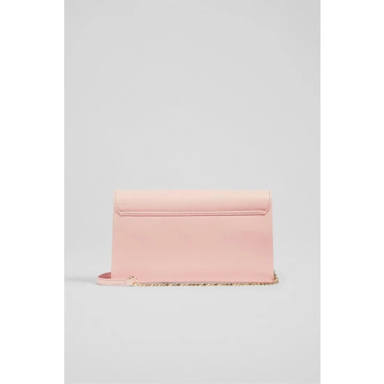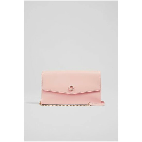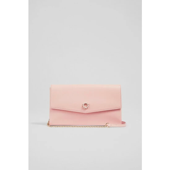 The Mason clutch is crafted in Spain from cream-pink leather. It’s an envelope style with a pearl button press stud fastening. It has a removable chain and leather shoulder strap, and inside it has a zip pocket.