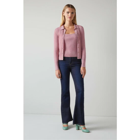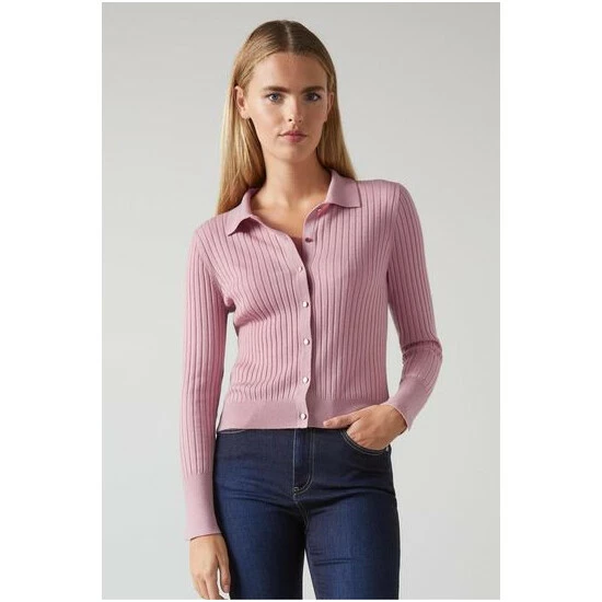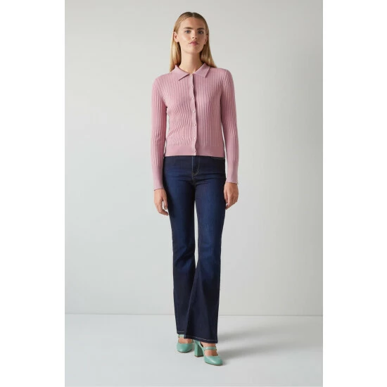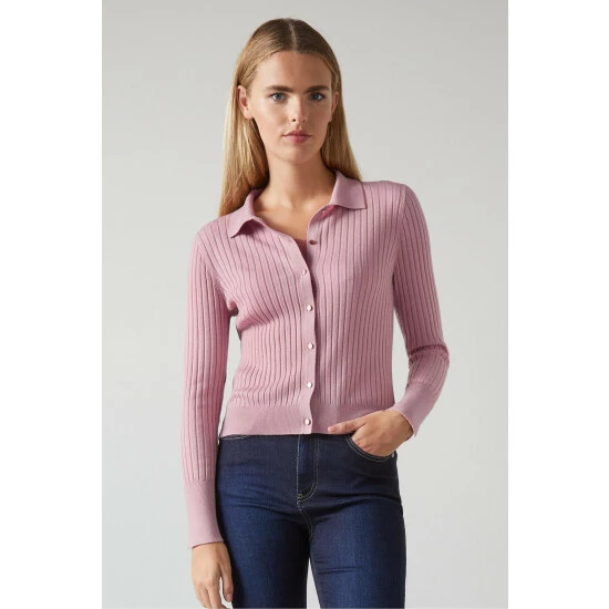 The Monmouth cardigan is crafted from sustainably sourced merino wool in rose pink. It’s a ribbed style with a neat collar, long sleeves, a close fit and flat matte gold buttons.