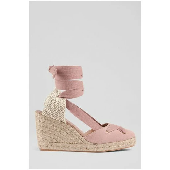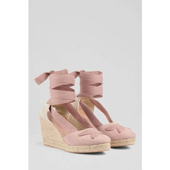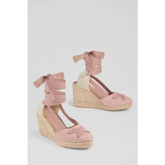 The Ophelia espadrilles are crafted in Spain from peachy pink suede. They have a round toe, crossover strap detail across the front, over the foot and around the ankles, and they have a natural raffia wedge sole.