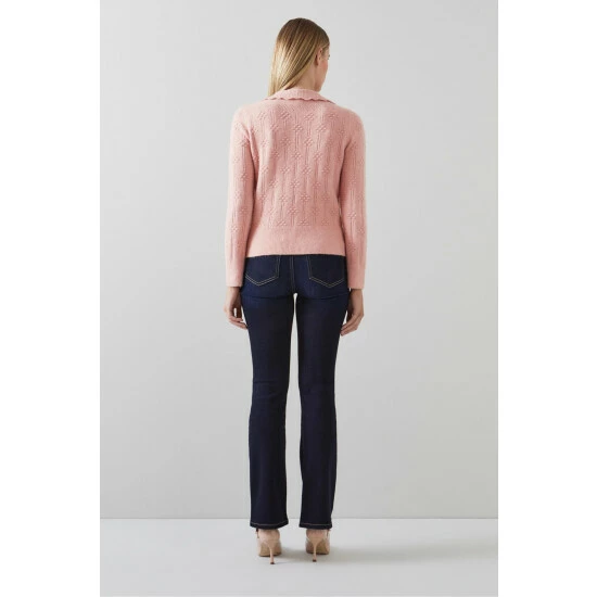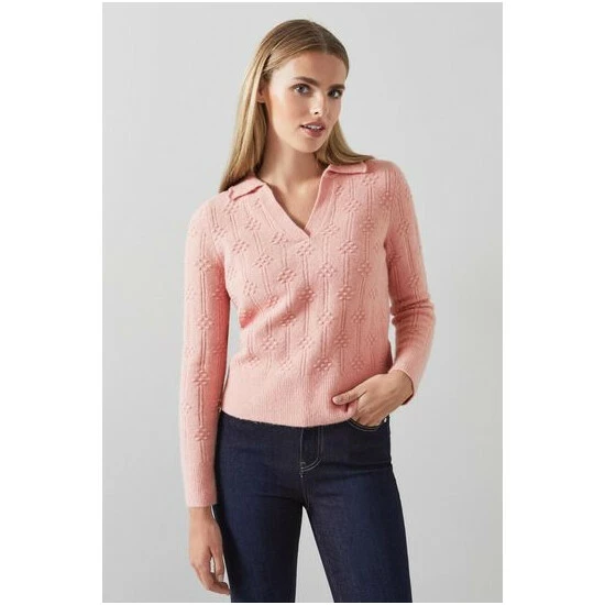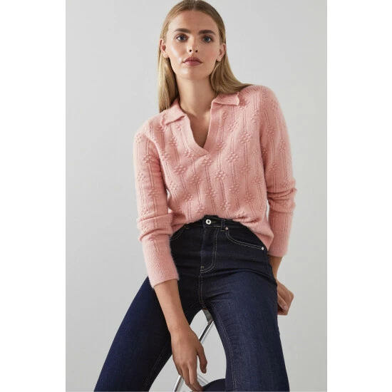 The Orla jumper is crafted from a blended fabric with hints of cashmere and merino wool in soft pink. This bubble knit is a V-neck style with a scalloped lace collar, long sleeves and ribbed cuffs and hemline