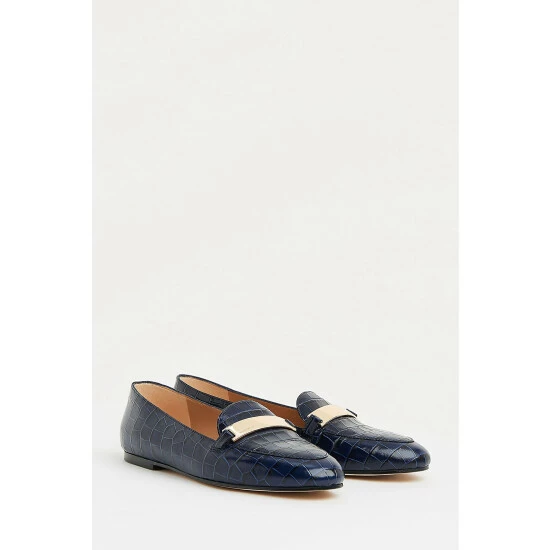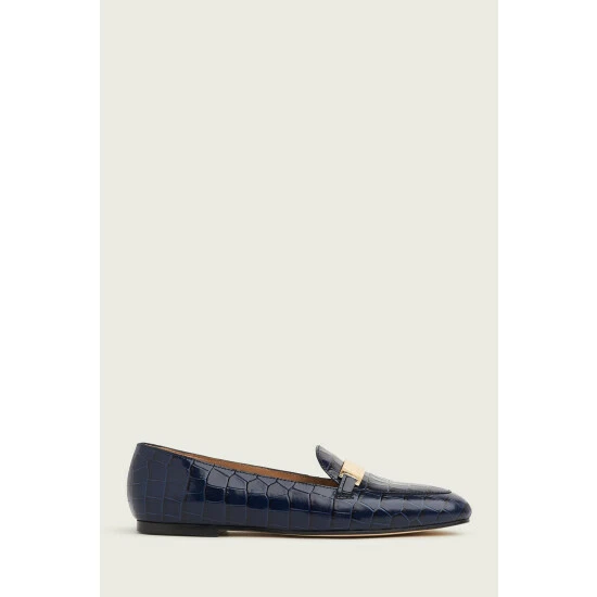 Placing a feminine spin on a classic loafer, the LK Bennett Primrose flats are an elegant everyday shoe. Crafted in Spain from navy blue croc-effect leather, this contemporary style has an almond-shaped toe and is finished with L.K.B logo metal hardware across the foot. The perfect shoes to take you between the seasons and into spring, they look great with chic tailoring.