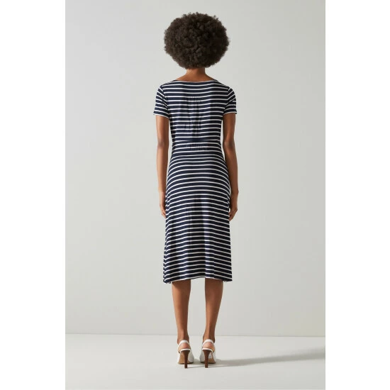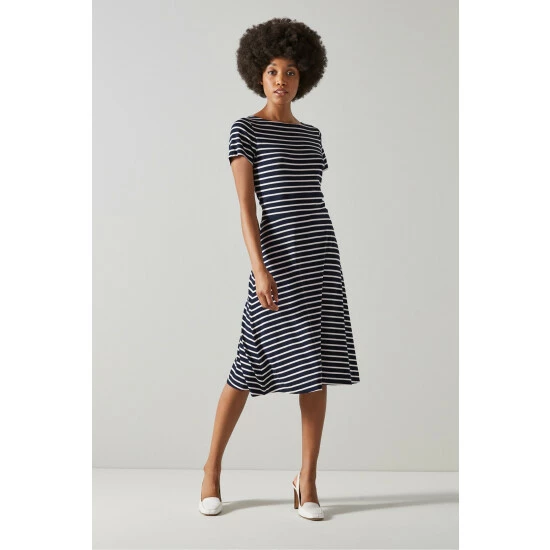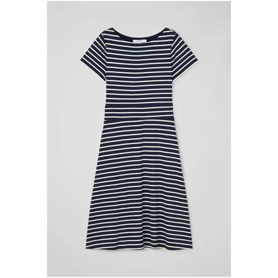 The Quinn dress is crafted in Portugal from navy and cream striped jersey. It has a wide round neck, short sleeves, a fitted bodice and an A-line skirt falling to just below the knee.