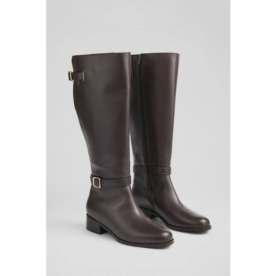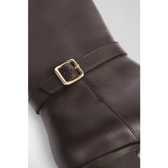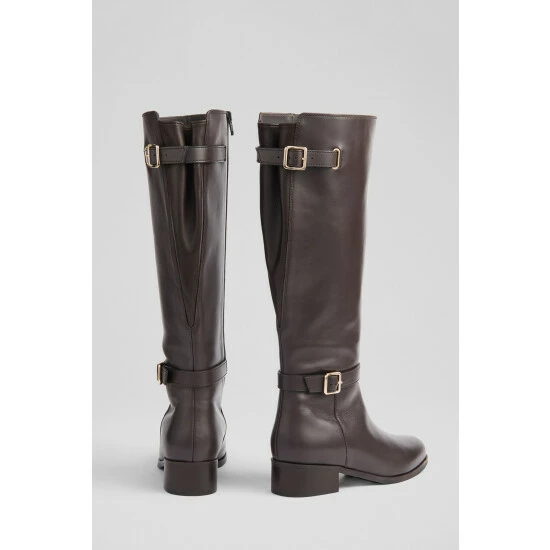 The Rea flat knee-high boots are crafted in Italy from calf leather in dark brown. They have a round toe, a buckle at the ankle, another at the calf that can widen or narrow the fit, inside zip and a 30mm block heel.