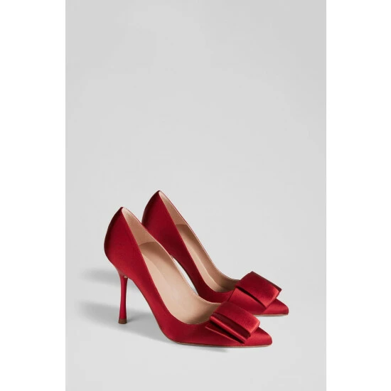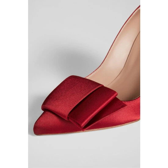 The Agathe court shoes are crafted in Spain from red satin. They have a pointed toe, half bow detail across the front of the foot, a sleek silhouette and a 100mm stiletto heel.