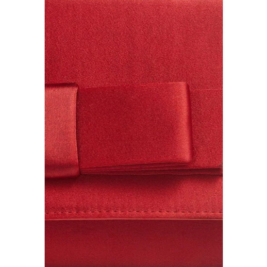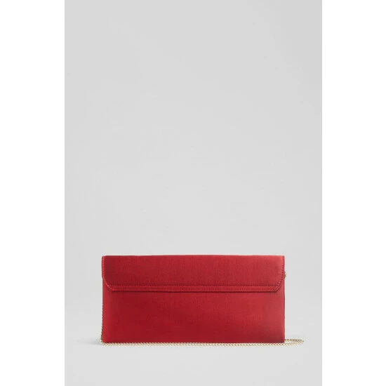 The Catalina clutch bag is crafted in Spain from red satin. It’s a long envelope style with half bow detail to the front, a removable chain shoulder strap and an inside zip pocket.