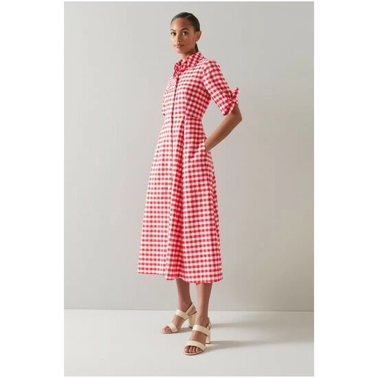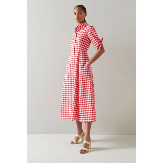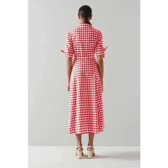 The Saffron shirt dress is crafted from red and white gingham check cotton. It has a neat collar, contrast white buttons, short sleeves with tie detail and a flared midi skirt.