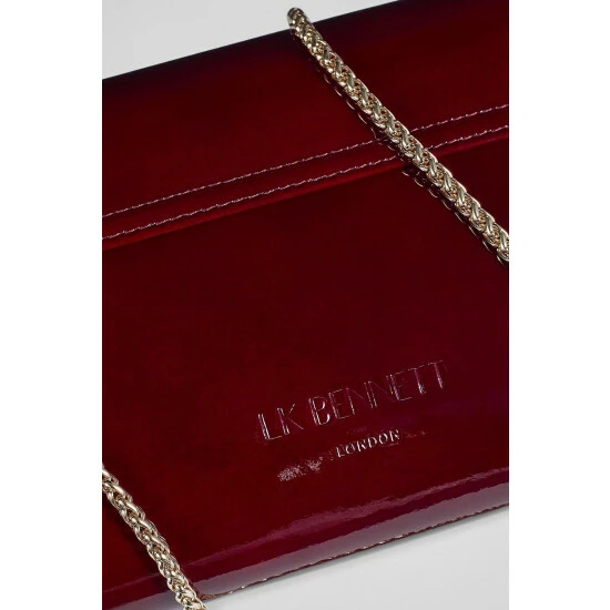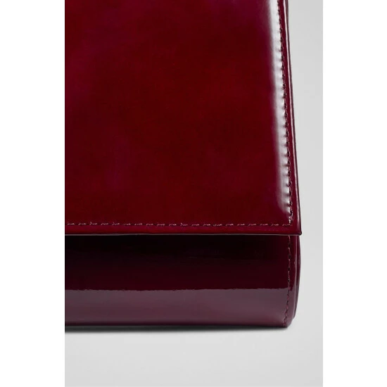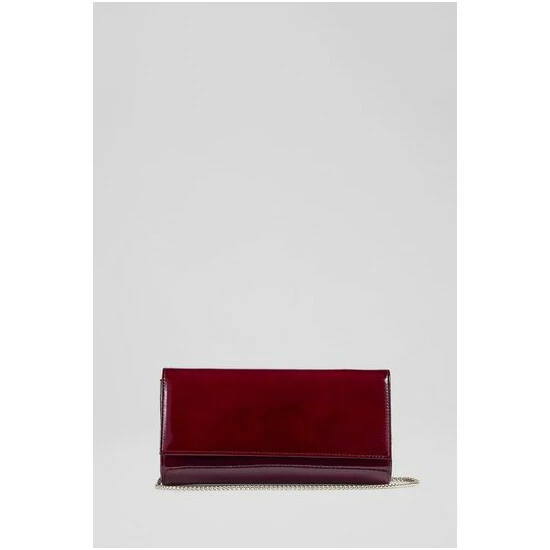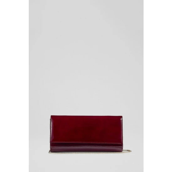 The Erin clutch is crafted in Spain from patent leather in a rich Cotes du Rhone red. It’s a long, fold-over style with a detachable chain shoulder strap, an inside slip pocket and a press stud fastening.