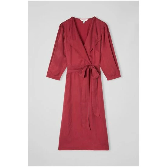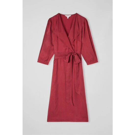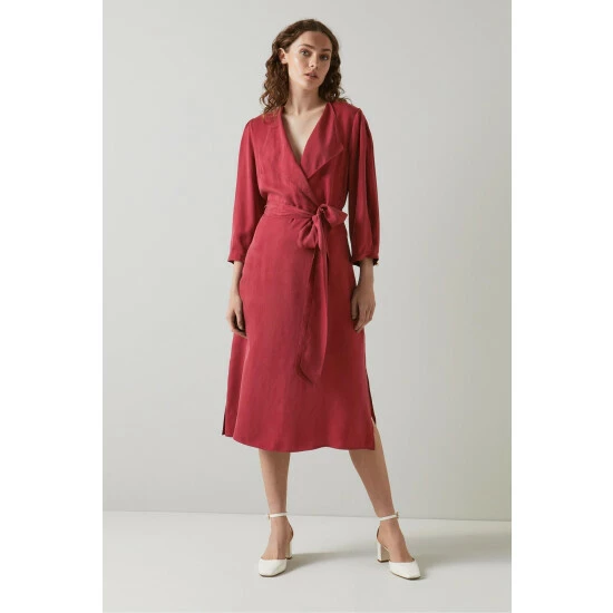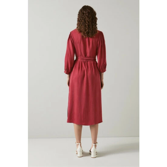 The Iris midi dress is crafted from cupro in red dahlia, It has an open-collar neckline, three-quarter sleeves, a tie waist belt and a floaty wrap skirt with side slit detail.