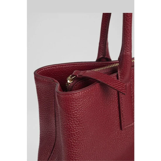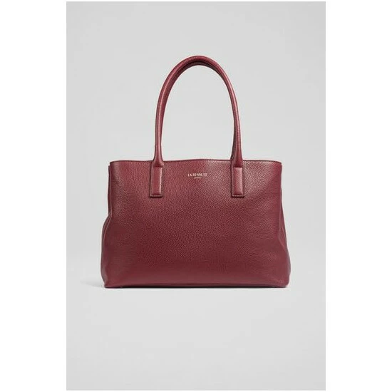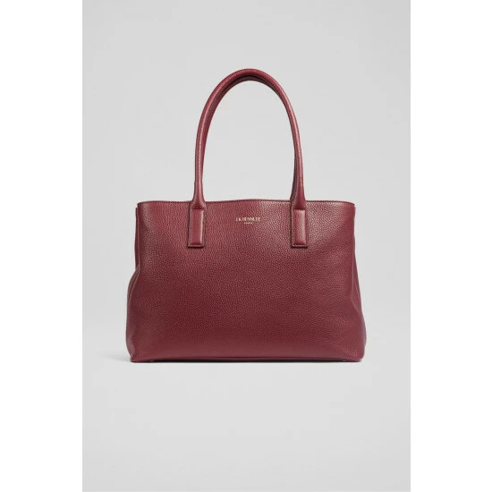 The Lilian tote bag is crafted in Italy from grainy leather in burgundy. It has three compartments – one of which zips up – that fit A4 papers and files, and has two large top handles.