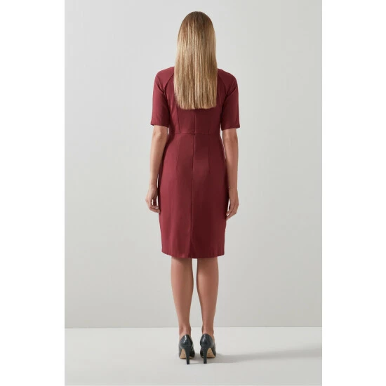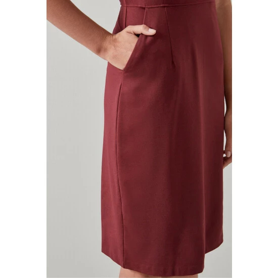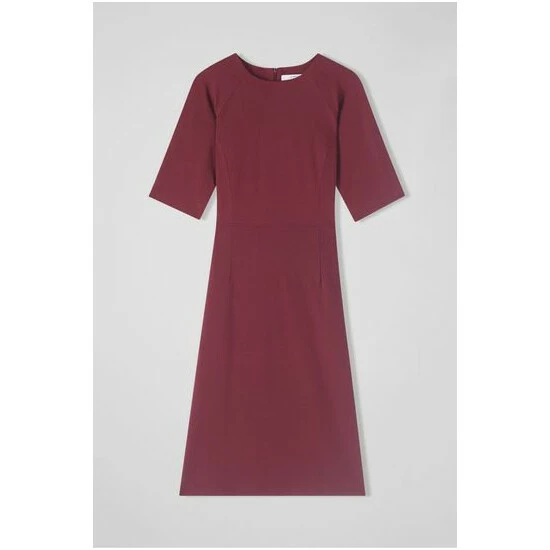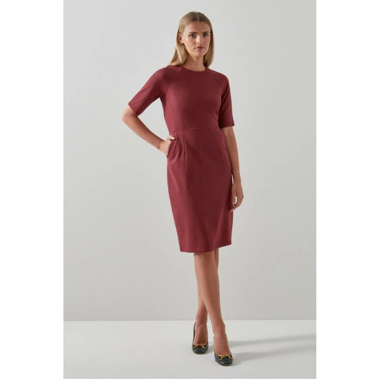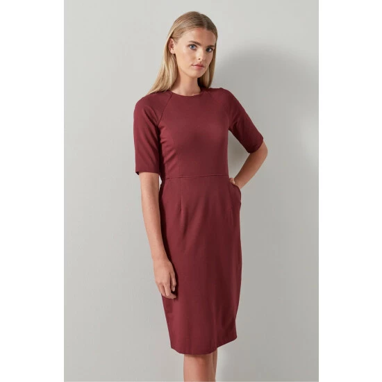 The Liya dress is crafted from a LENZING™ ECOVERO™ blend jersey in Cabernet red. It has a round neck, elbow-length sleeves, side pockets, a shapely, slim fit and falls to the knee.