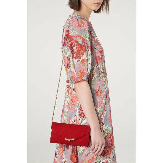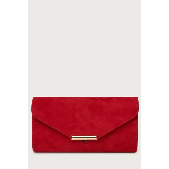 The Lucy clutch is crafted in Spain from red suede. It’s a small, rounded envelope shape with a detachable shoulder strap, gold hardware and fastens with a gold clasp.