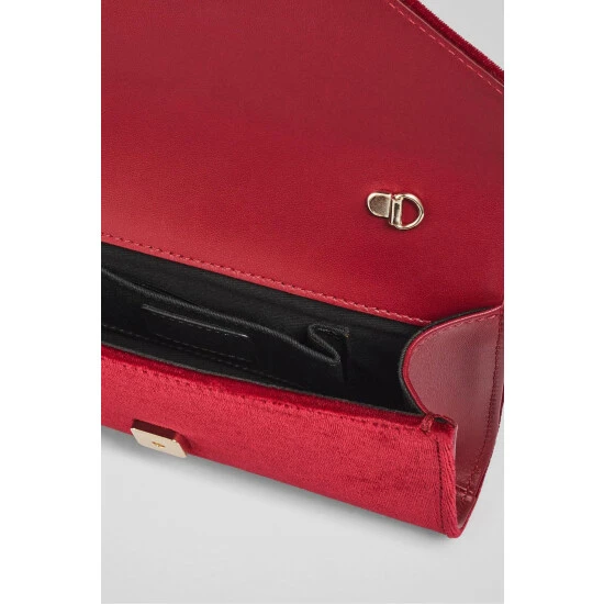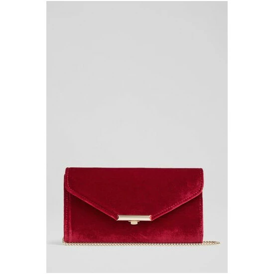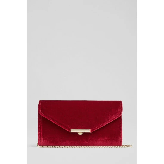 The Lucy clutch bag is crafted in Spain from velvet in red dahlia. It s a small, rounded envelope shape and has a detachable chain shoulder strap, an inside pocket and closes to the front with a gold tone clasp.